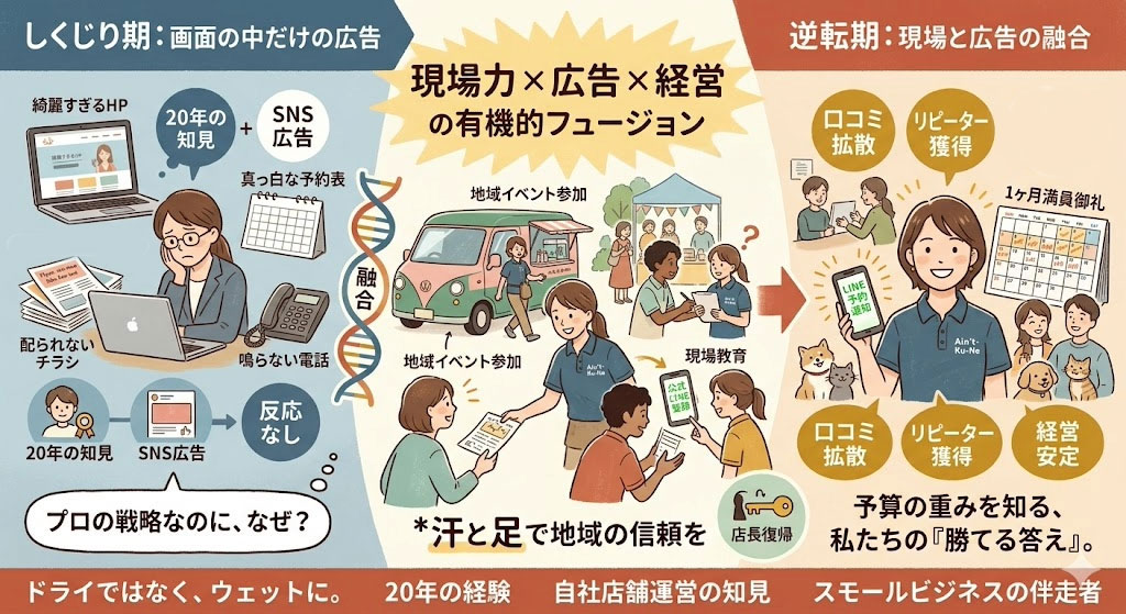 広告業界に身を置いて20年。数千通りの戦略を立ててきた自負がありました。しかし、いざ自社でトリミングサロンを立ち上げると、現実は残酷でした。折込チラシを撒いても、HPを整えても、予約表は真っ白。