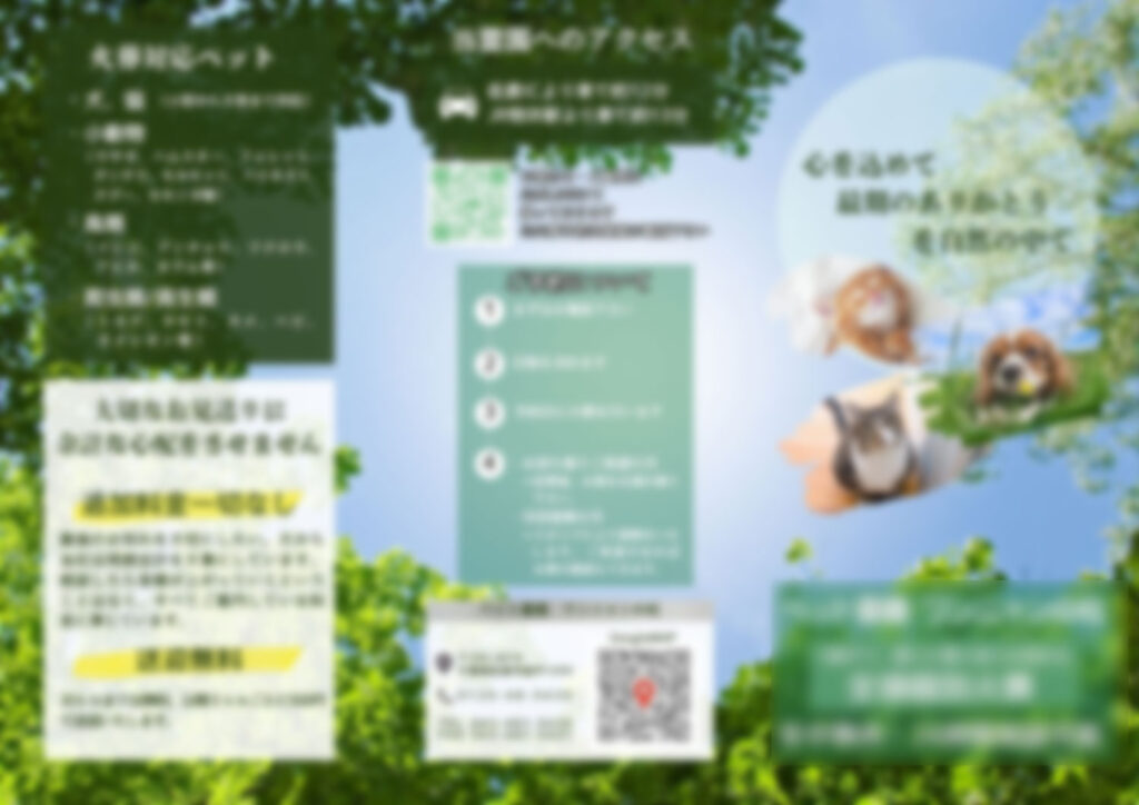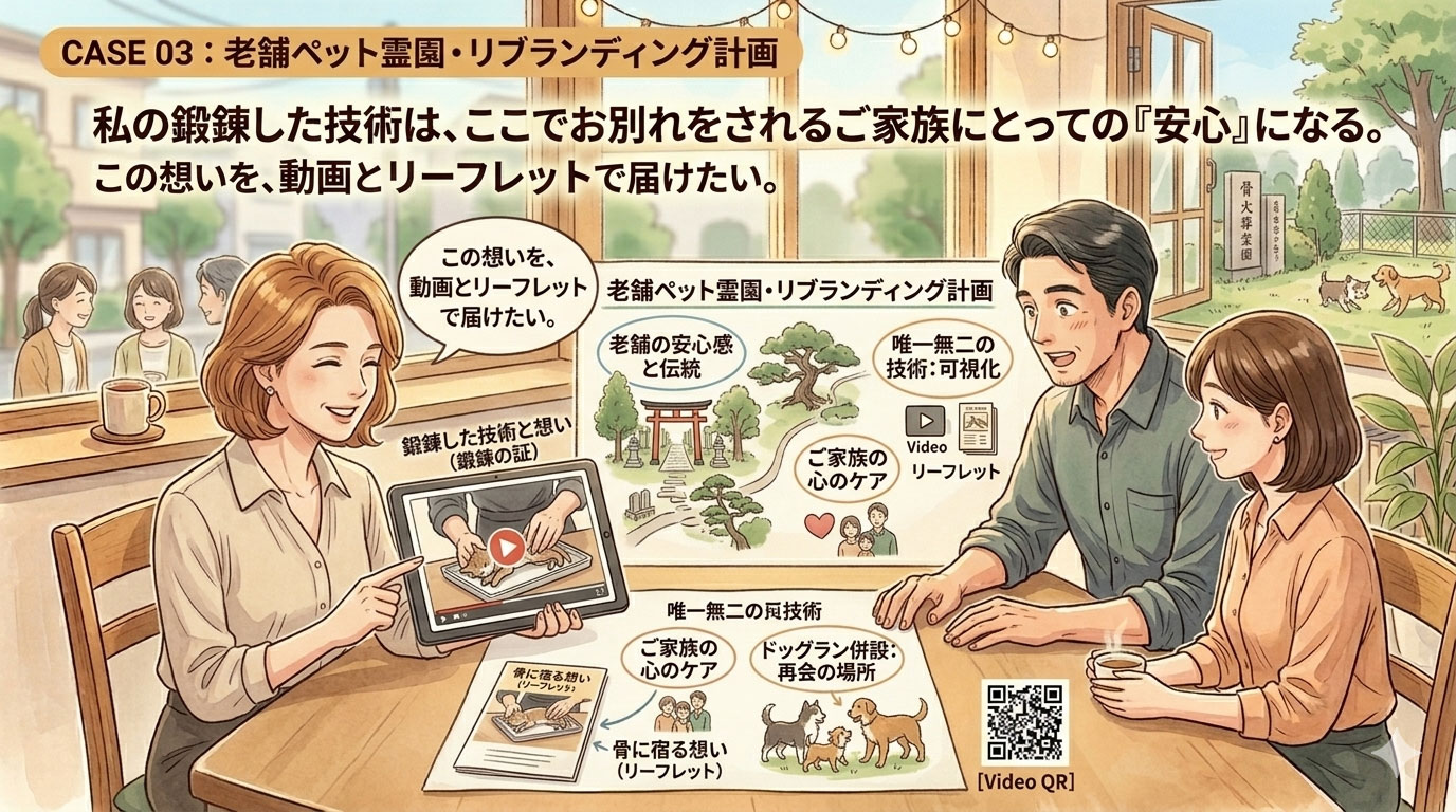 • 想いが詰まったリーフレット: 従来の「施設案内」中心のパンフレットを廃止。オーナー様の「技術」と「想い」にフォーカスし、心が温まるような手厚いペット葬儀サービス中心の構成へ。
